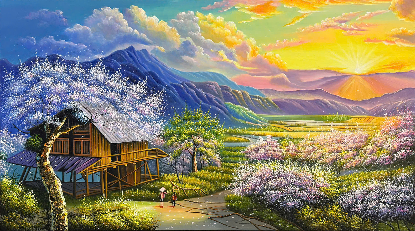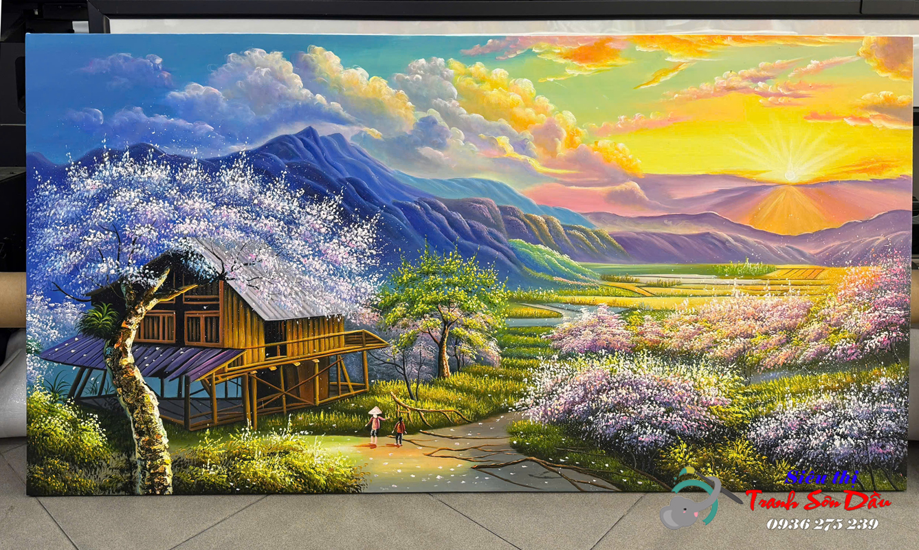 Tranh sơn dầu bình minh trên núi Tây Bắc STT558 tại Minh Hưng Gallery được vẽ bằng tay 100% bằng màu sơn dầu